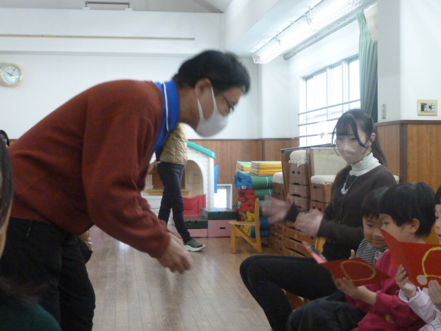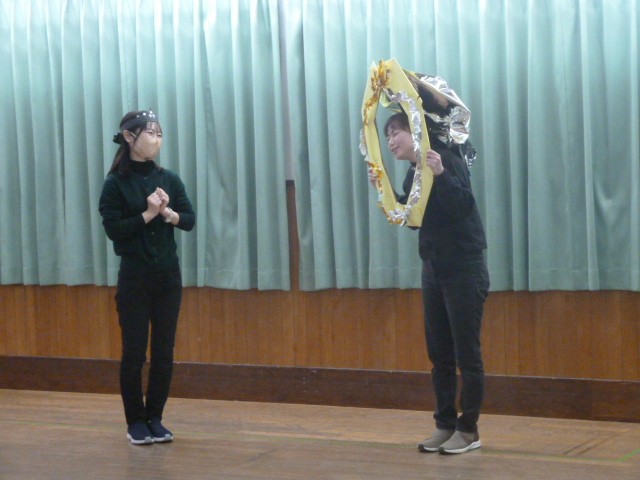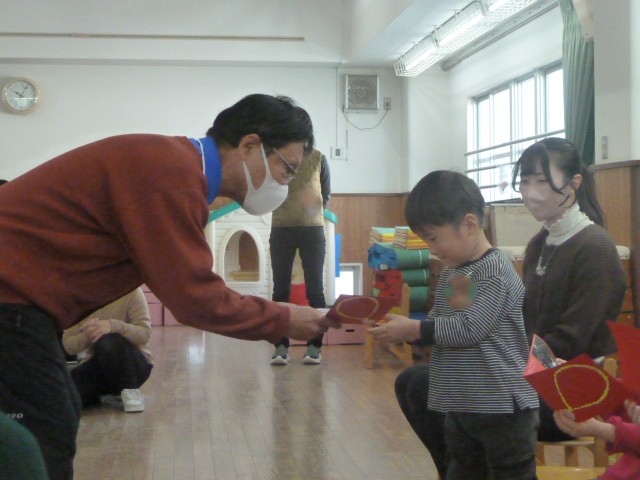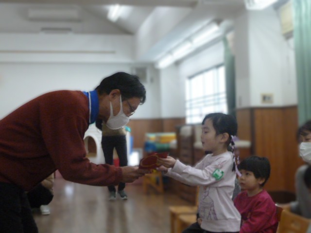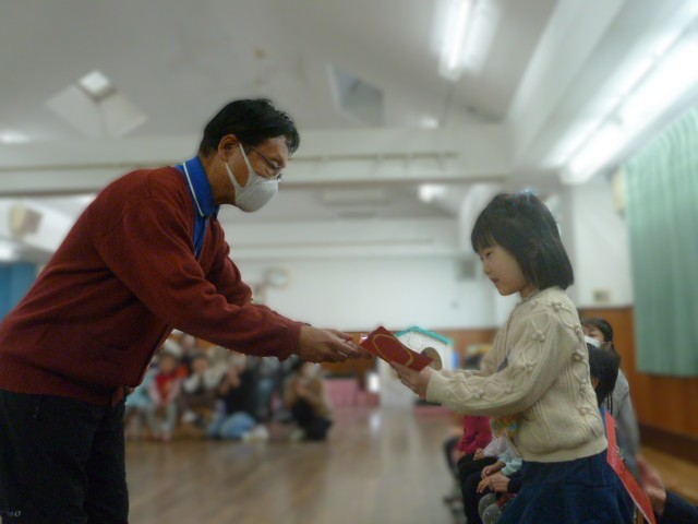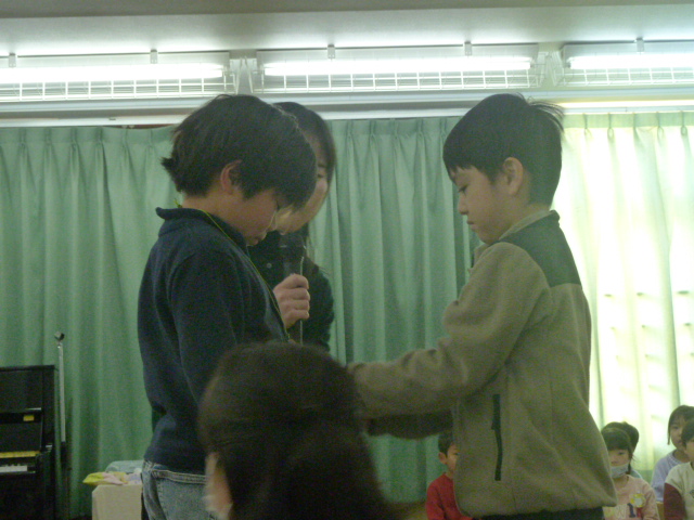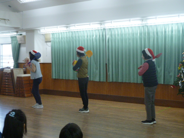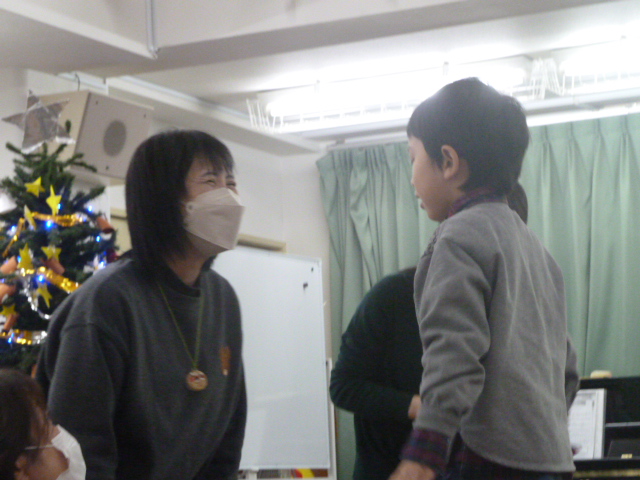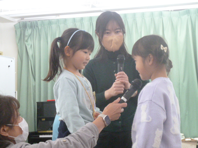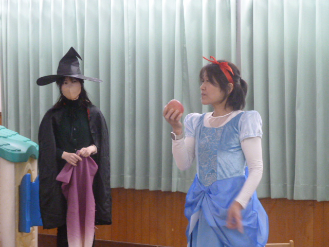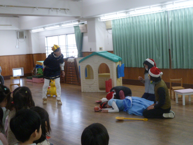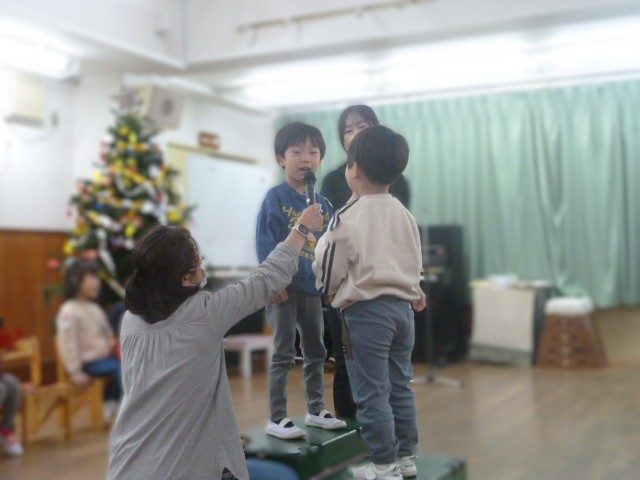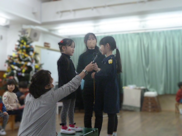 2025.12.2312月誕生会 12月はペンダントを模した切り絵の誕生カードをいただきました。 誕生月の子はお友達からかけてもらった手作りのペンダントを胸に下げ、インタビューを受けます。 おたのしみは… 先生たちによる劇「白雪姫」です。 さて!王子様は何に乗ってやってきたでしょう⁈