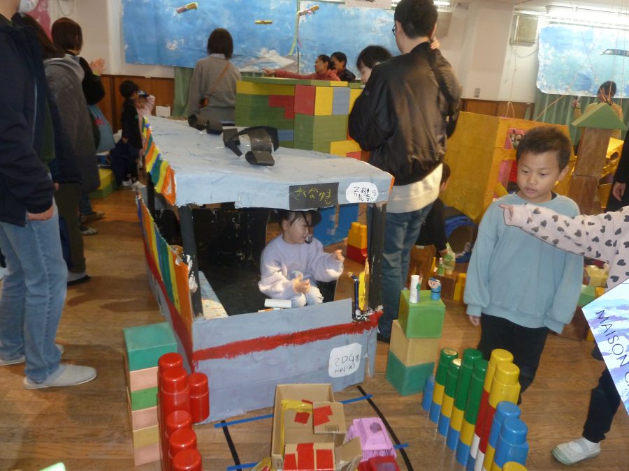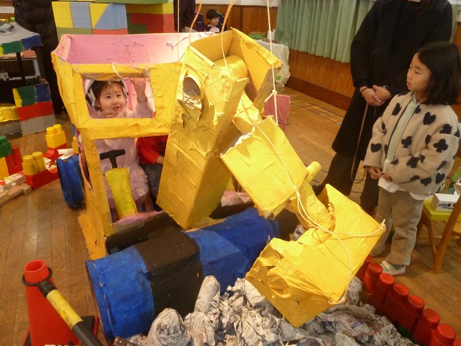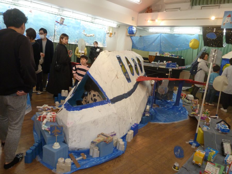 2026.03.27のりものいっぱいの世界(作品展) 今年度の作品展は子どもたちの日頃の遊びに端を発して、乗り物をテーマに作りました。 製作の過程では、園を飛び出し、実際に電車に乗って「電車とバスの博物館」を見学をするなど 製作のイメージとなるような経験をしました。 保護者参加の作品作りではたくさんの保護者の方々にご協力をいただきありがとうございました。 作品展当日の子ども達は自分たちで作った乗り物の世界で存分に遊びつくし、開始から終了まで大賑わいでした。