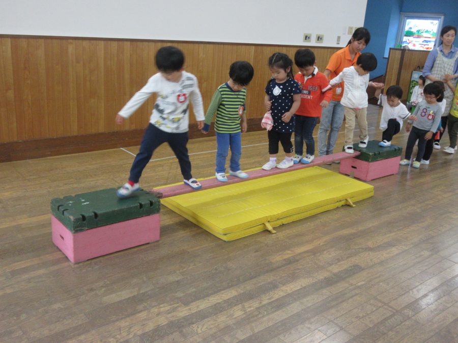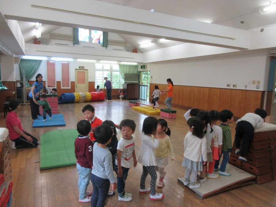 2017.05.26今日の保育・・・ クラスで過ごす子どもたちは、年少児はホールでトンネルくぐりや平均台で一本橋、大きな跳び箱から大ジャンプ!のサーキットあそび そして年中児はタッチゲーム(リレー)やブロック積みゲーム 年長児はタッチゲームやフープくぐりに白熱し楽しんでいました。