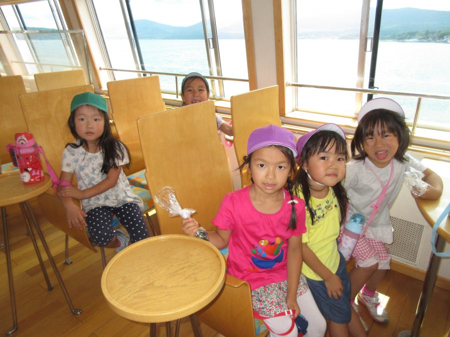 2017.07.31山中湖一泊保育 その3 朝食を済ませ部屋を片付け、荷物をまとめるとロッヂを後にし、 山中湖へと向かいました。 白鳥の親子の出迎えを受けた子供たちは 遊覧船に乗り込みます。 船内ではあちらこちらを見て回り、船長さんになり切りハンドルを握ったり、デッキで湖の爽やかな風を受けたり、船室のテーブル席でおしゃべりを楽しんだり どの子も嬉しさいっぱいで遊覧船の旅を満喫していました。 その後、ロッヂに戻り昼食をいただくと、迎えの観光バスが到着。幼稚園までの帰路へとバスが走り出しました。