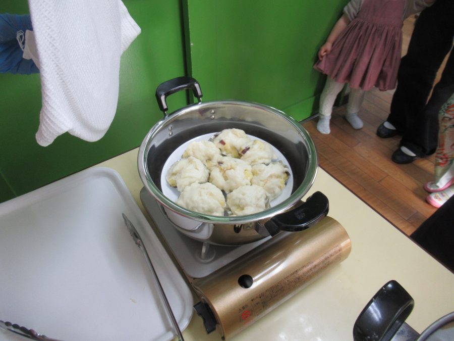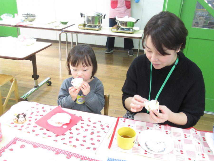 作った蒸しパンを親子でいただく様子は「おいしいね。」「嬉しいね。」が溢れます。